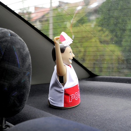 Zamontuj kibica w samochodzie, przyklejając go na deskę rodzielczą lub za tylną szybę. Bądź pewien, że nie umknie on uwadze żadnym kierowcom ani ich pasażerom! Stojąc w ulicznym korku lub na światłach będą podziwiać oryginalnego kibica, wczuwając się w gorącą atmosferę mistrzostw!